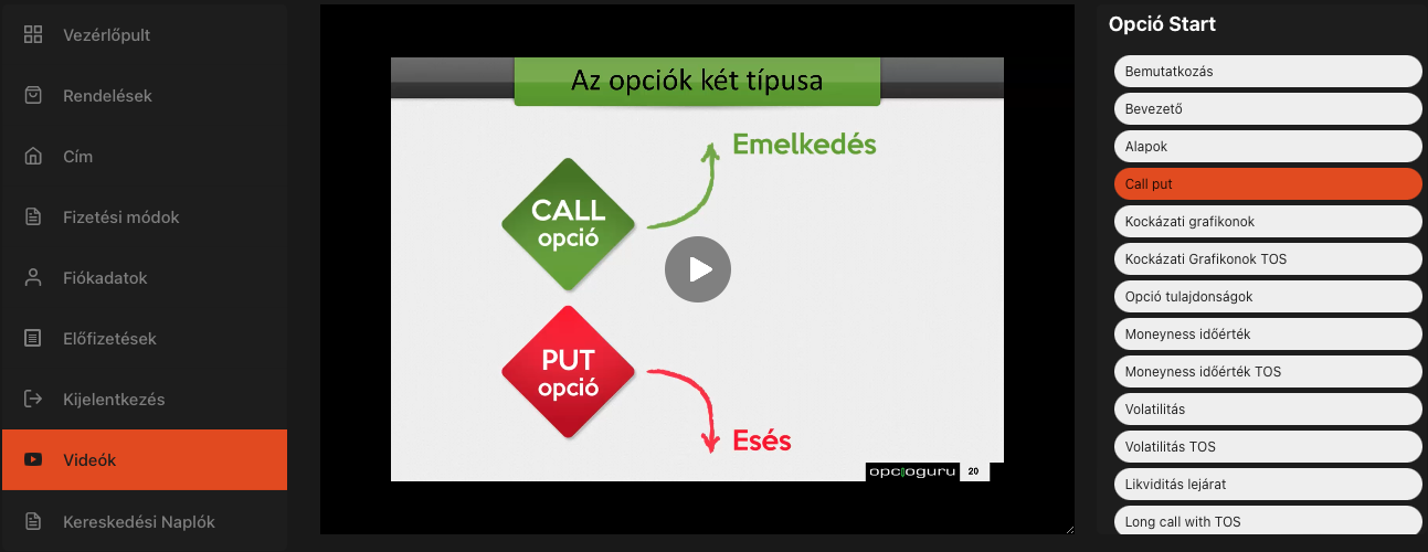 A vásárlást követően a felhasználói fiókodban azonnal elérhetővé válik a Kripto Opció Start tananyag. A fiókod utolsó „Videók” menüjében keresd!
